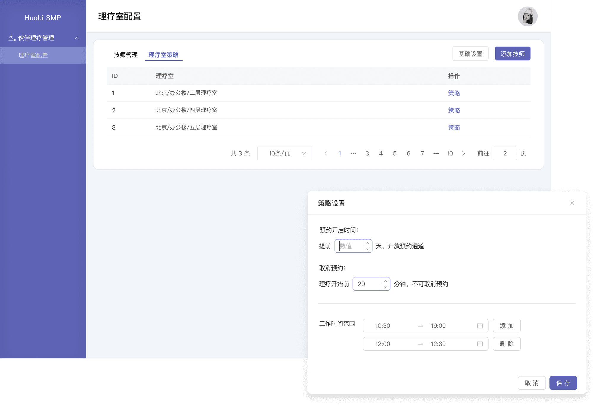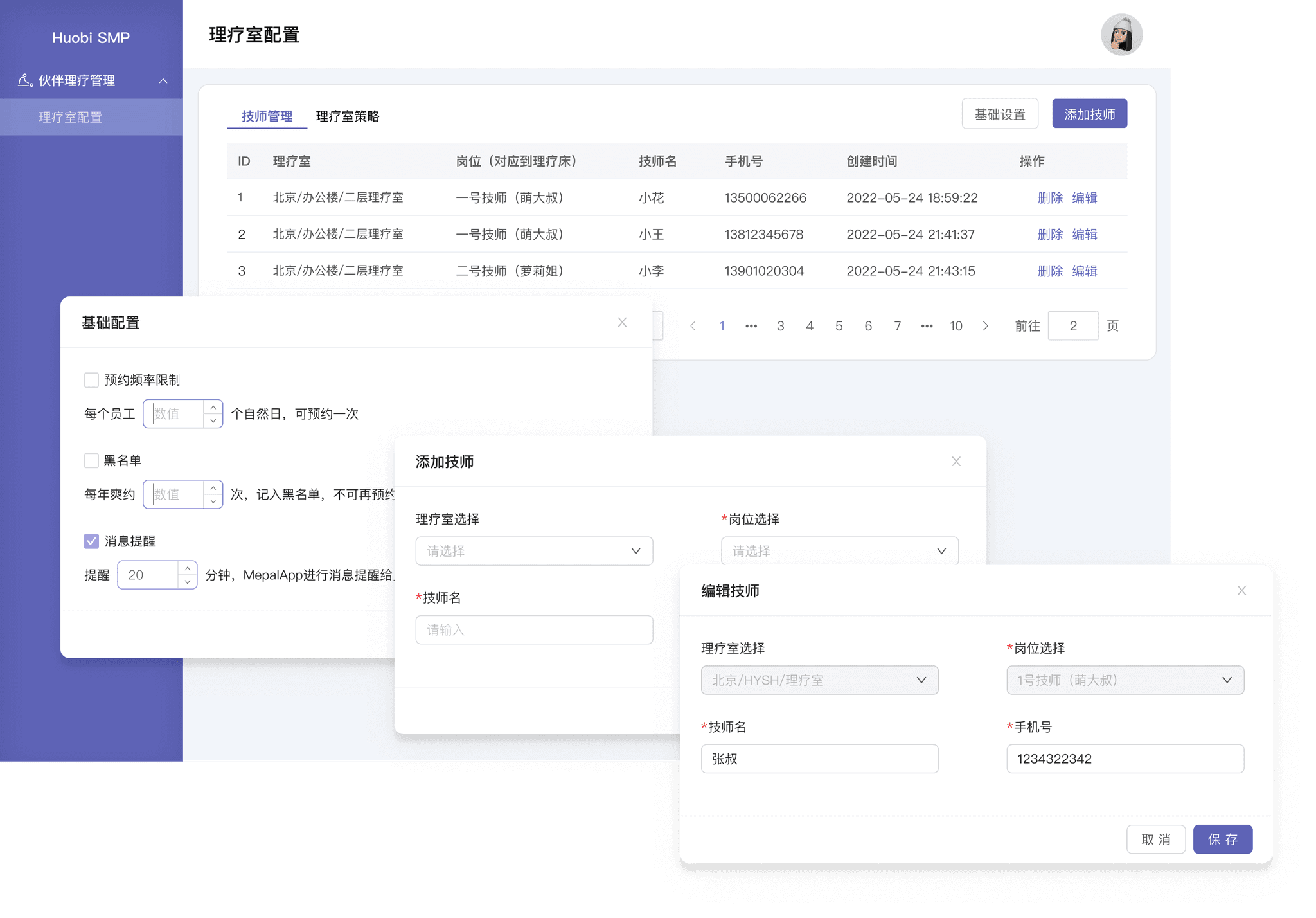 管理端分为技师管理、理疗室策略、基础设置: