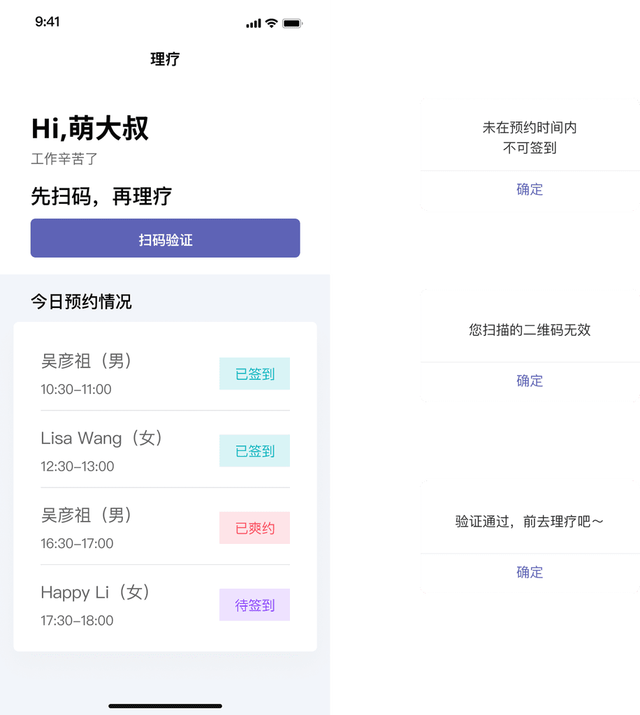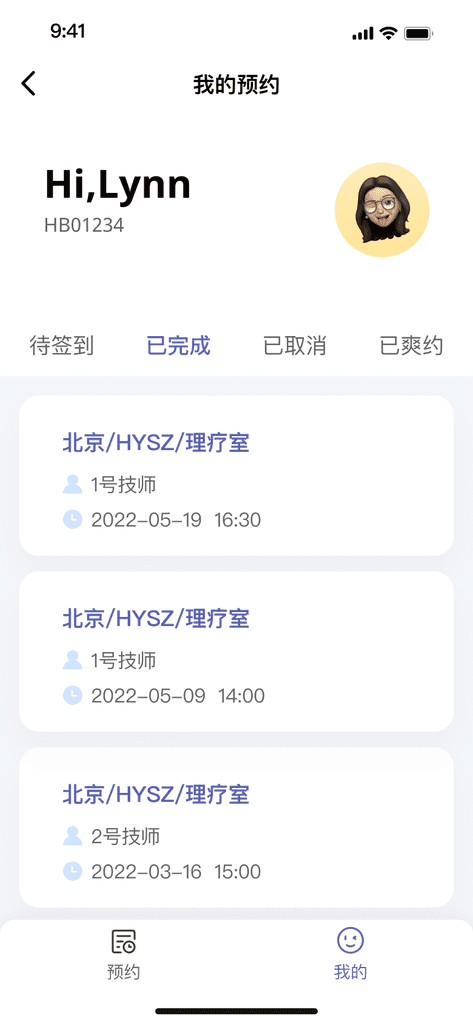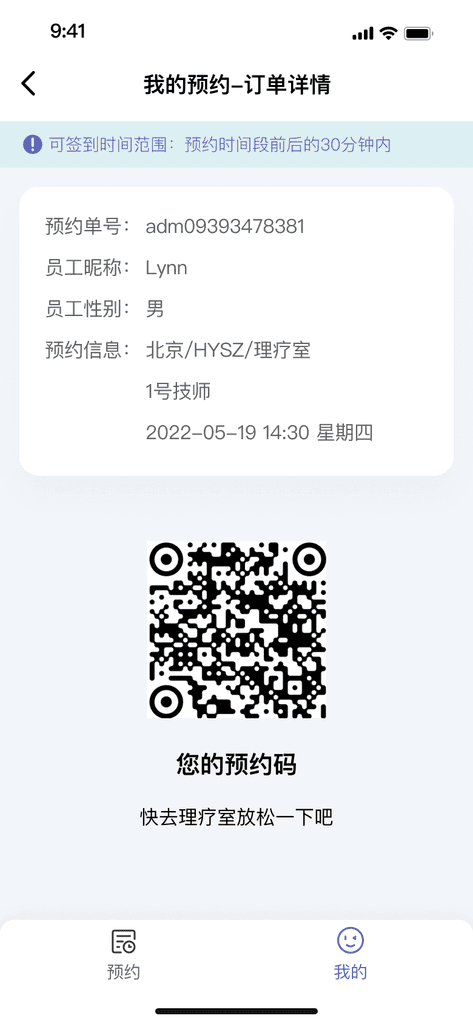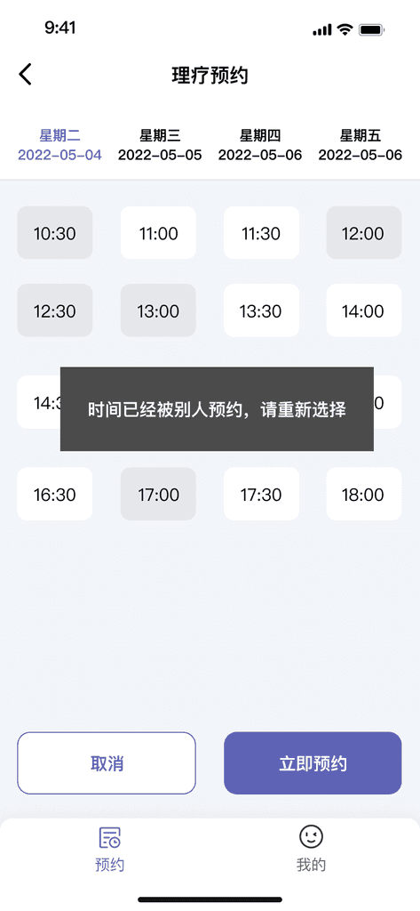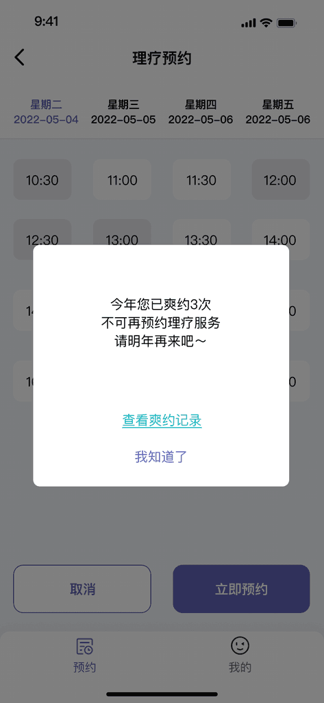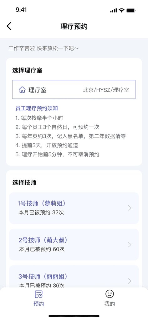 原理疗室的使用为人员纸质登记。随着员工的增多、员工在多个楼层,而无法随时知晓理疗忙闲情况。为了更好地收集统计数据:理疗数据可收集,统计理疗师使用率、统计员工使用频次。从0-1设计一套“理疗预约”APP