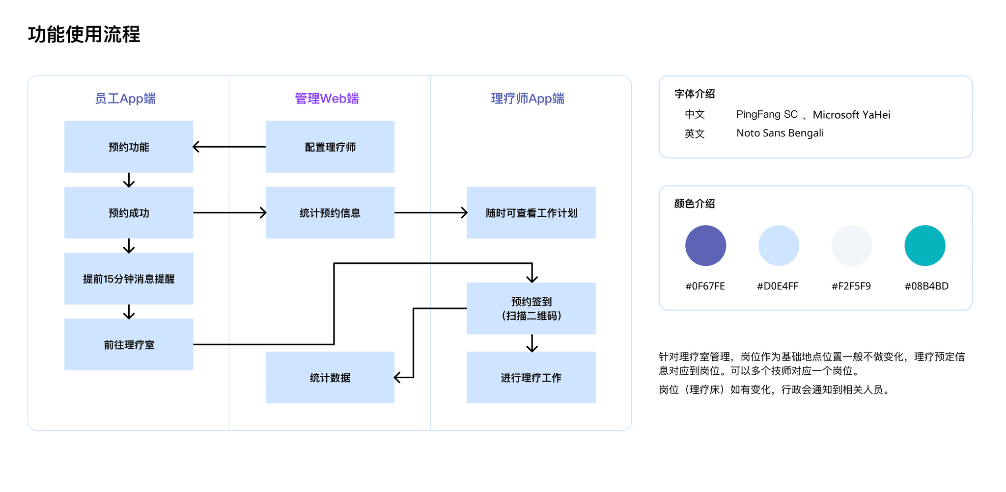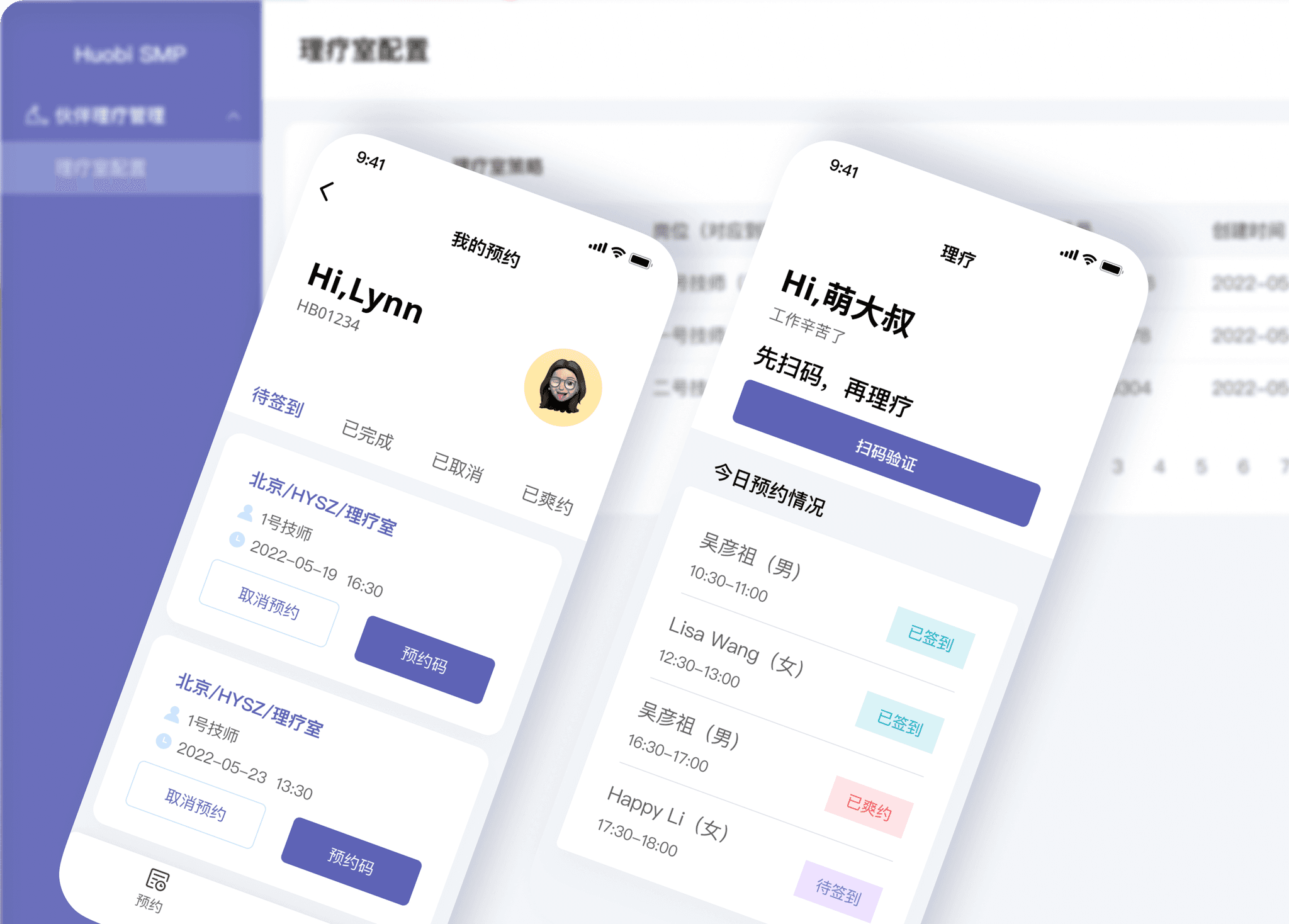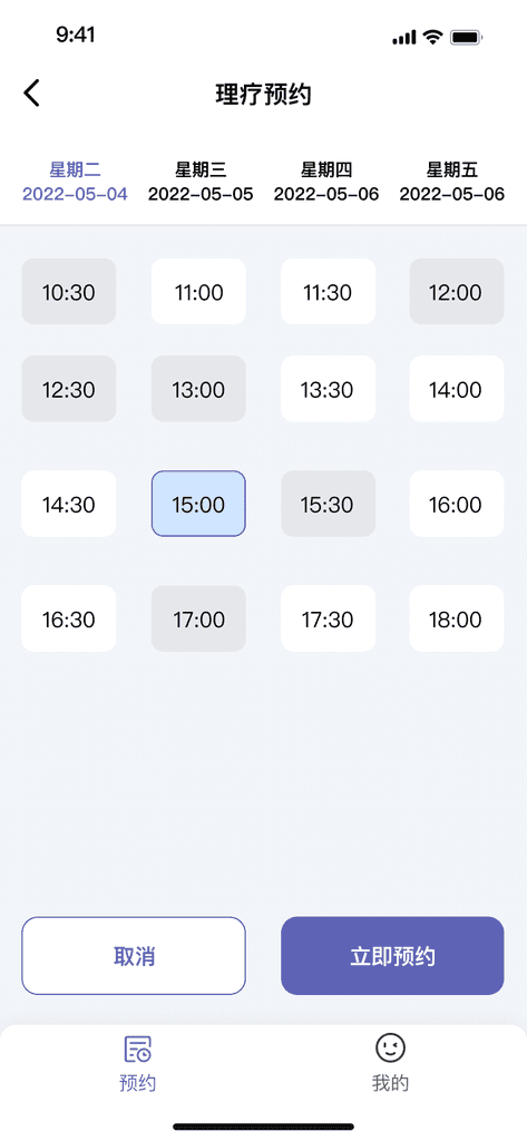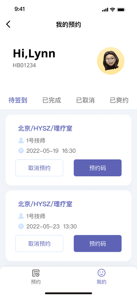 原理疗室的使用为人员纸质登记。随着员工的增多、员工在多个楼层,而无法随时知晓理疗忙闲情况。为了更好地收集统计数据:理疗数据可收集,统计理疗师使用率、统计员工使用频次。从0-1设计一套“理疗预约”APP